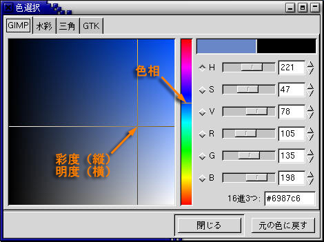 すると「色選択」のウィンドウが現れます。色の選択方法は4種類ありますが、そのうちの "GIMP" について解説します。
