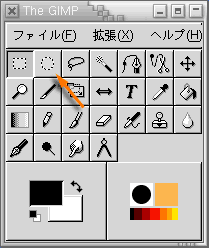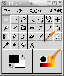 まず、ペンの色を決めます。前景色は描画に使う色です。前景色を設定するには、"The GIMP" ウィンドウの「前景色の設定」をクリックしてください。