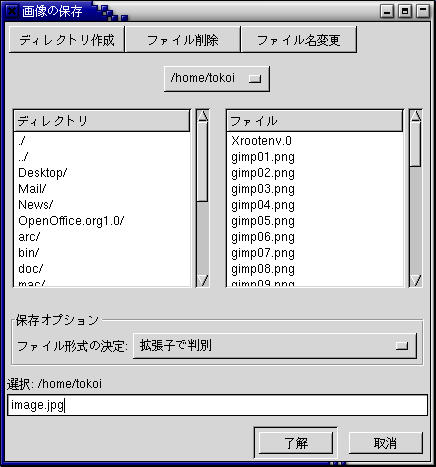 ファイル名を指定します。拡張子は保存するファイルの形式で決定してください。