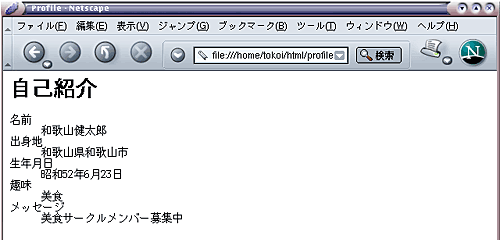 出来上がったら C-x C-s でファイルを保存し,Netscape の「再読み込み」ボタンをクリックしてください.“自己紹介”の文字の色が変わっていると思いますから, それをクリックしてください. 先ほど作った自己紹介のページが表示されましたか?