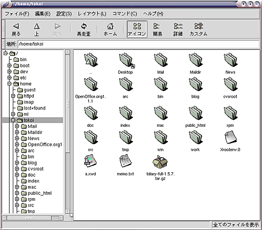 このようにファイルは,本来データの集まりに名前を付けたものに過ぎず,目に見えるような形を持ったものではありません.しかし,それでは,特にコンピュータに関する知識をあまり持っていない人にとって,とっつきにくいものになってしまいます.そこで,このファイルに対して目に見える仮の姿を与えることがよく行われます.Vine Linux では,これにファイルマネージャ (gmc) というアプリケーションソフトウェアを用います.なお,このようにコンピュータの操作に視覚的な表現を用いる場合を,グラフィカルユーザインタフェース (GUI) と言います.