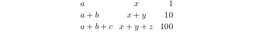 \[\left(\begin{array}{lcr} a & x & 1 \\ a+b & x+y & 10 \\ a+b+c & x+y+z & 100 \end{array}\right)\]