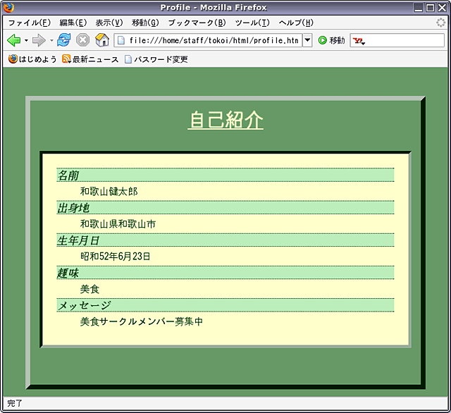<!DOCTYPE HTML PUBLIC "-//W3C//DTD HTML 4.01 Transitional//EN"> <html lang="ja"> <head> <title>Profile</title> <meta http-equiv="Content-Style-Type" content="text/css"> <style type="text/css"> <!-- body { border: outset 8px; line-height: 2; margin-top: 3em; margin-left: 5%; margin-right: 5%; height: 30em; color: #003300; background-color: #669966; } dl { border: inset 5px; padding: 1.5em; margin: 1em; background-color: #ffffcc; } dt { font: bold italic larger serif; border-top: dotted thin; border-bottom: dotted thin; background-color: #bbeebb; } h1 { text-align: center; text-decoration: underline; color: #ffffcc; } --> </style> </head> <body> (中略) </body> </html>