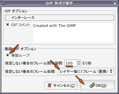 最後にアニメーションのさせ方(無限ループ,すなわち繰り返すか1回きりか)やアニメーションの速度(指定しない場合のフレーム間の時間,この時間が長いほどアニメーションの速度は遅くなります)を指定して,「了解」をクリックしてください.「指定しない場合のフレームの処理」は「レイヤーごとに1フレーム(置換)」を選んでください.