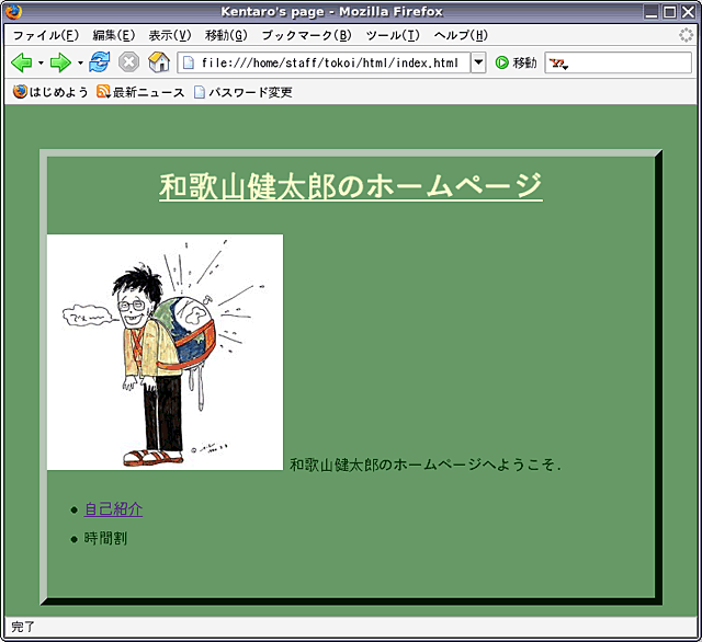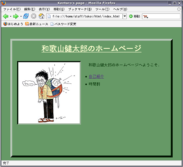 次に,profile.swf をこの profile.html と同じディレクトリに移します.mv か cp コマンドを使って,ホームディレクトリにある(はずの)profile.swf をカレントディレクトリ (html) に移してください(方法がわからなかったら質問してください).その後,Firefox に表示されている index.html の中にある自己紹介のページへのリンクをクリックして,このページを開いてください.