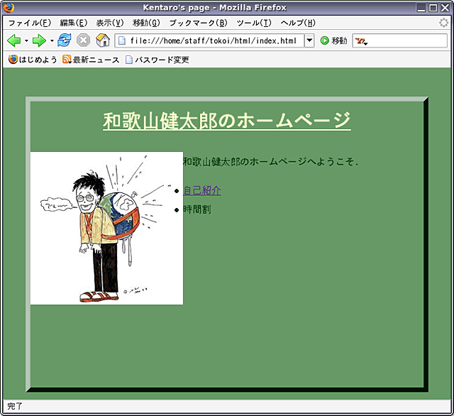 src 属性に指定している画像ファイル名 (image.jpg) は,ディレクトリ html に入れた実際の画像ファイル名にしてください.また width と height には,それぞれその画像の幅と高さを指定してください.出来上がったら, C-x C-s でファイルを保存してください. その後,Firefox で index.html を開いてください.画像がホームページに埋め込まれましたか?