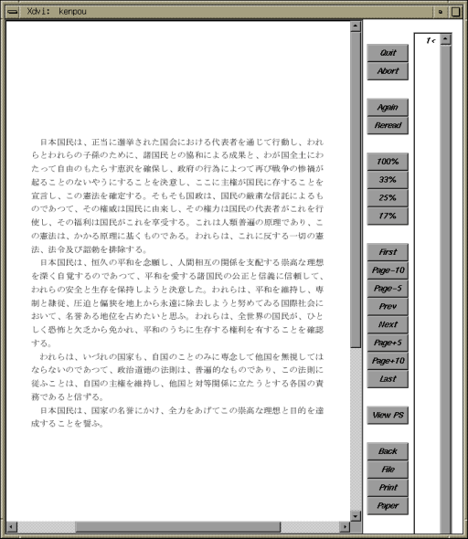 kenpou.dvi は TeX (LaTeX) によってレイアウトを整えた印刷用のデータファイルで,DVI ファイルと言います.それでは xdvi コマンドを使って,このファイルの内容を画面上で確認してみましょう.
