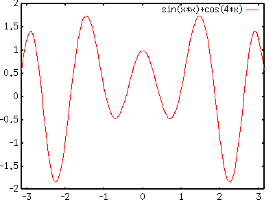 gnuplot> plot [-pi:pi] [-2:2] sin(x*x)+cos(4*x)[Enter] |