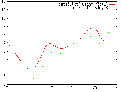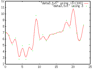 gnuplot> plot "data3.txt" using 3 smooth cspline[Enter] |