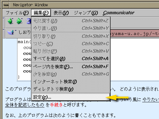 Netscape のメール機能を使ってメールを出すときは、 今一度設定を確認してください。 メニューバーの“編集”から“設定”を選んでください。