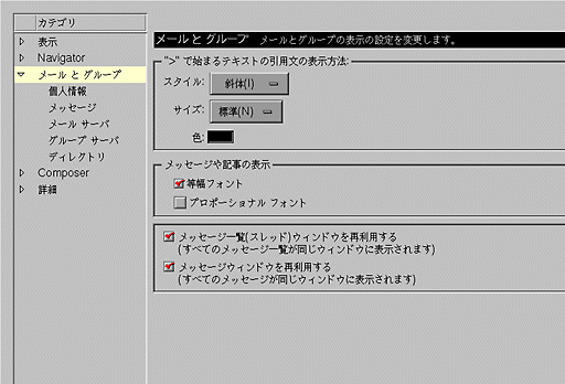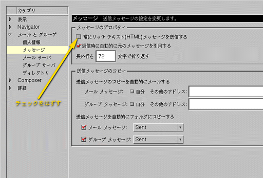 “常にリッチテキスト(HTML)メッセージを送信する” のところのチェックをはずしてください。 次に“カテゴリ”から“メールサーバ”を選んでください。