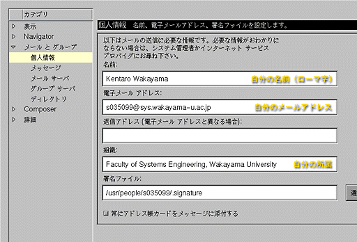 - “電子メールアドレス”の欄には自分の電子メールアドレスを書いてください。 6階の演習室の場合は「ログイン名@sys.wakayama-u.ac.jp」です。