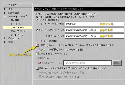 最初に“メールサーバの種類:”のところにある“POP3 にチェックを付けてください。 そのあと以下の項目を設定してください。