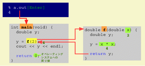 この例は引数に 2 を与えて関数 f() を呼び出し、 その戻り値を y に代入した後、 y を出力するという関数 main() を定義しています。 main() の最後の return 0; は、main() の戻り値を 0 にすることを意味します。 この値は、この関数を評価して(呼び出して)いるところ (オペレーティングシステム)に戻されます。 main() 関数のデータ型は int です。