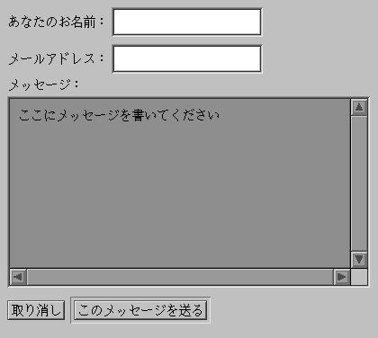 <head> <title>Form sample</title> </head> <body> <form> あなたのお名前: <input type="TEXT" name="NAME" maxlength="40"><br> メールアドレス: <input type="TEXT" name="ADDR" maxlength="40"><br> メッセージ:<br> <textarea name="MESG" cols="48" rows="10"> ここにメッセージを書いてください</textarea><br> <input type="RESET" value="取り消し"> <input type="SUBMIT" value="このメッセージを送る"> </form> </body> |